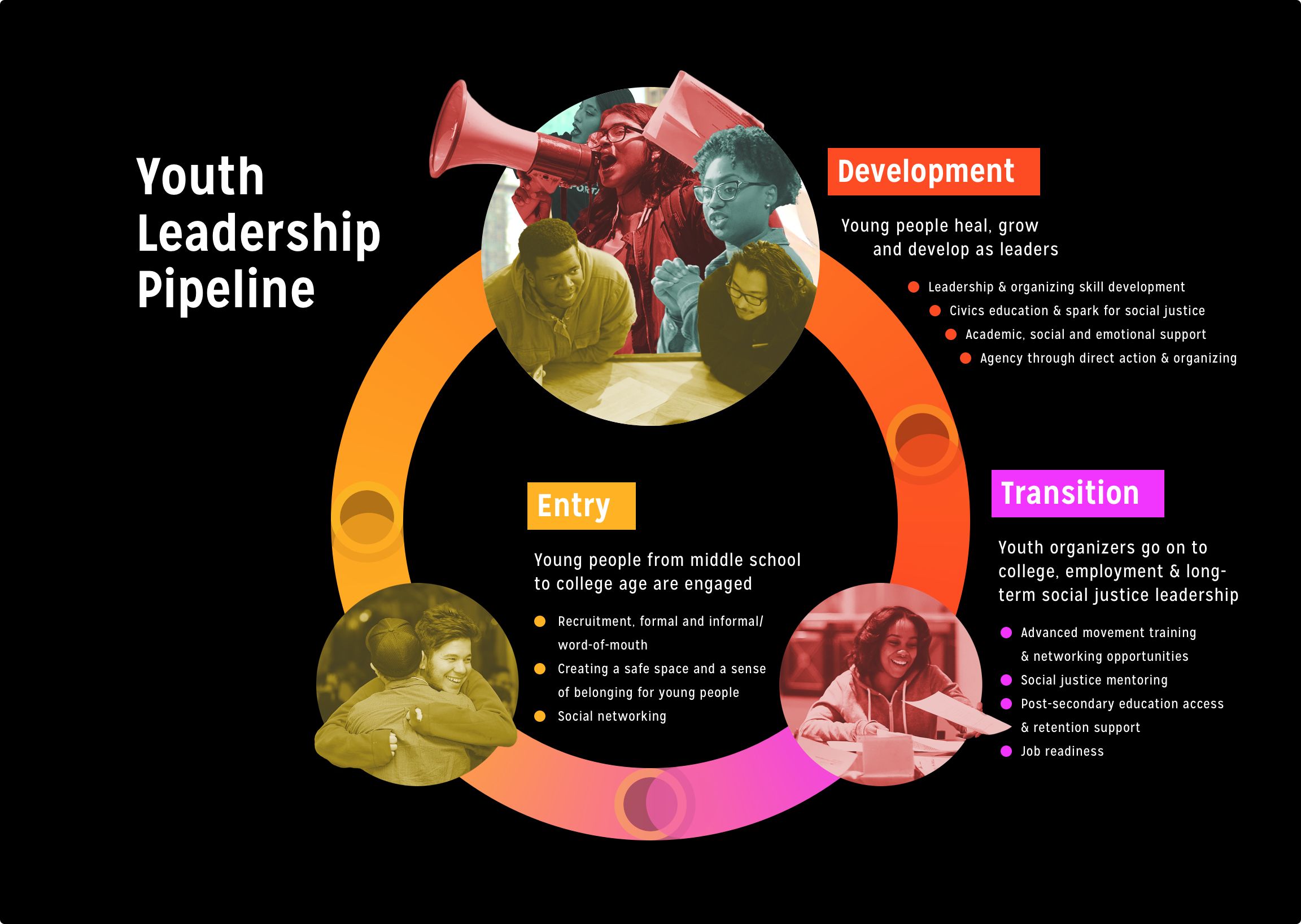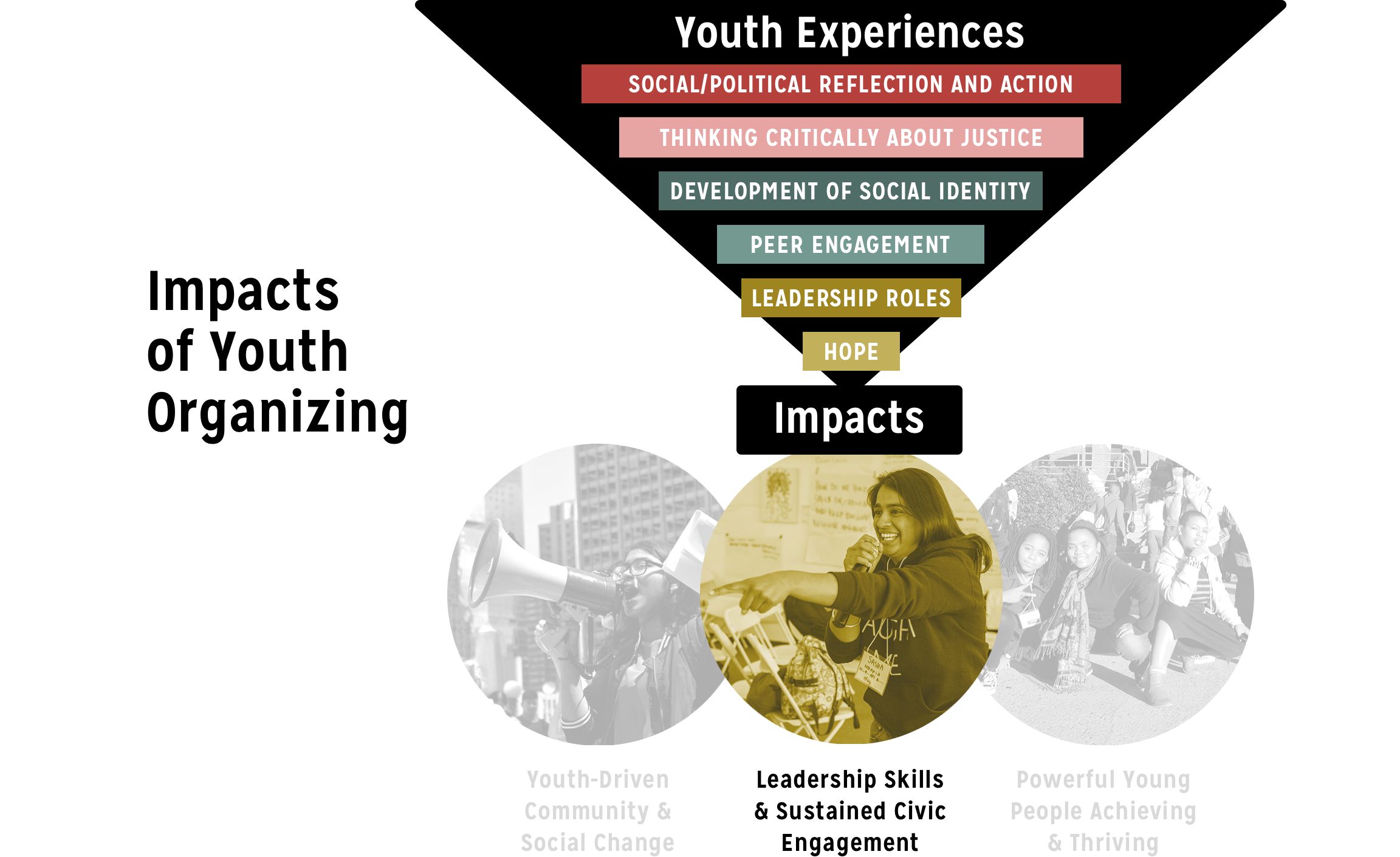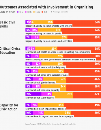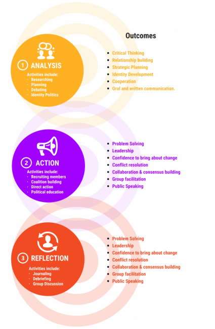 As young people engage in campaigns, organizing staff engage them in a distinct cycle of learning that involves analysis, action and reflection. These categories should be considered as overlapping and cyclical—analysis leads to action, action to analysis, and reflection to further analysis—and the outcomes they support are cumulative and overlapping as well. ANALYSIS usually involves exploring the origins and systemic causes of social and political problems, translating those problem into issues, and identifying parties responsible for bringing about desired changes . Analysis builds skills such as researching, planning, critical thinking, strategy development, debate, consensus building, and discussion—all of which are traditional youth development assets. ACTION involves a collective, public activity that confronts decision-makers and pressures them to make a desired change. Action includes a range of activities: speaking at a city council meeting, informational picketing, writing letters to officials, circulating petitions, displaying banners, and holding public demonstrations. REFLECTION is an important component of youth organizing because it fosters personal, intellectual, and spiritual growth. Participants learn to evaluate their strategies, monitor their activities and even gauge their own commitment to changing the problem. Reflection might include journaling, debriefing with peers about an issue or experience, or discussing the effectiveness of a particular event.